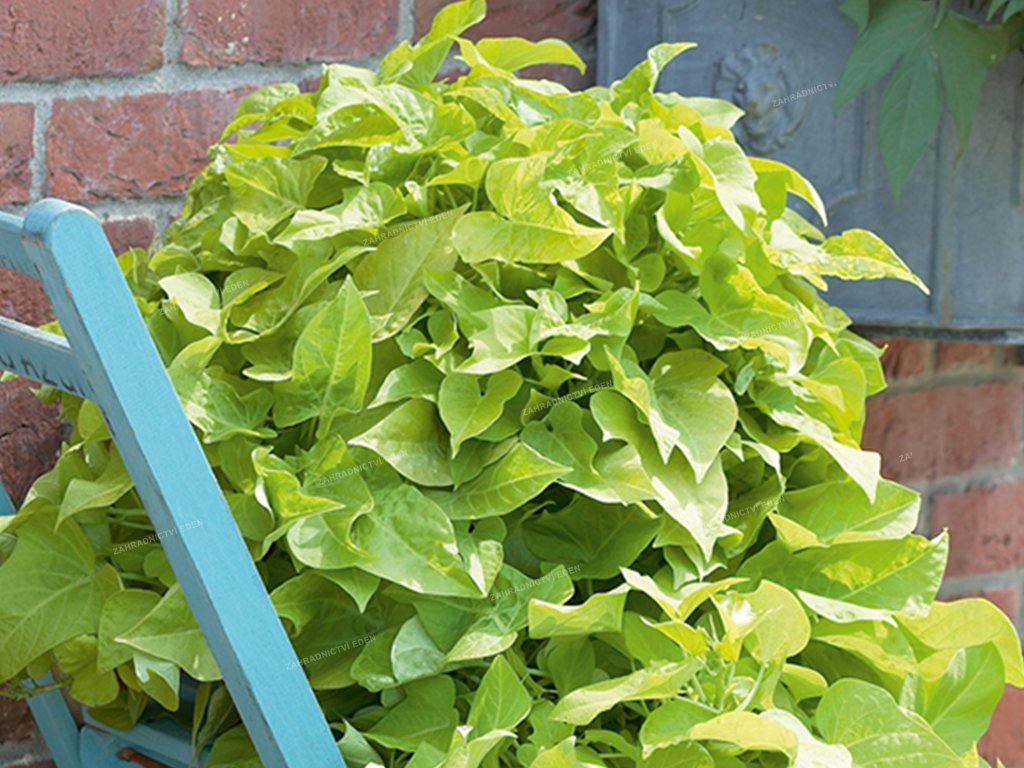 Rostliny skupiny Sunpuma mají kompaktní vzrůst. Ipomea Sunpuma Lime 06 má zářivě limetkově zelené olistění.